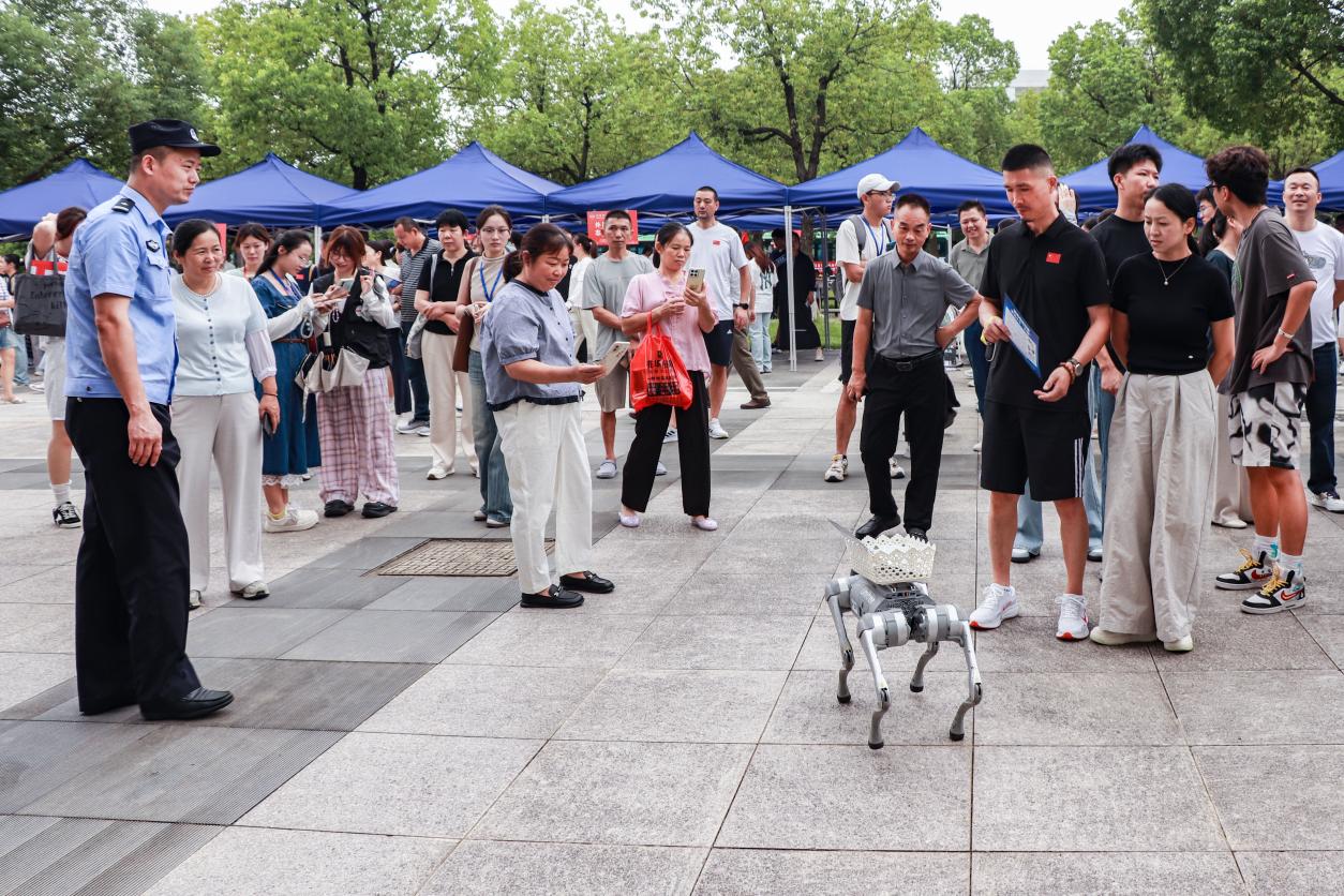 现场,该公司“IT青年先锋队”的志愿者们全程守护着“小卫士”。身穿红色志愿马甲的计算机科学与技术专业2023(3)班的张国栋负责机器狗的传单补给以及设备看护工作,他笑着说:“机器狗今天特别受欢迎,吸引了不少员工和家长前来互动,反诈防骗宣传单页散发效率高,自取的效果也更好,很多人领完后都会拿着传单和它合影。”