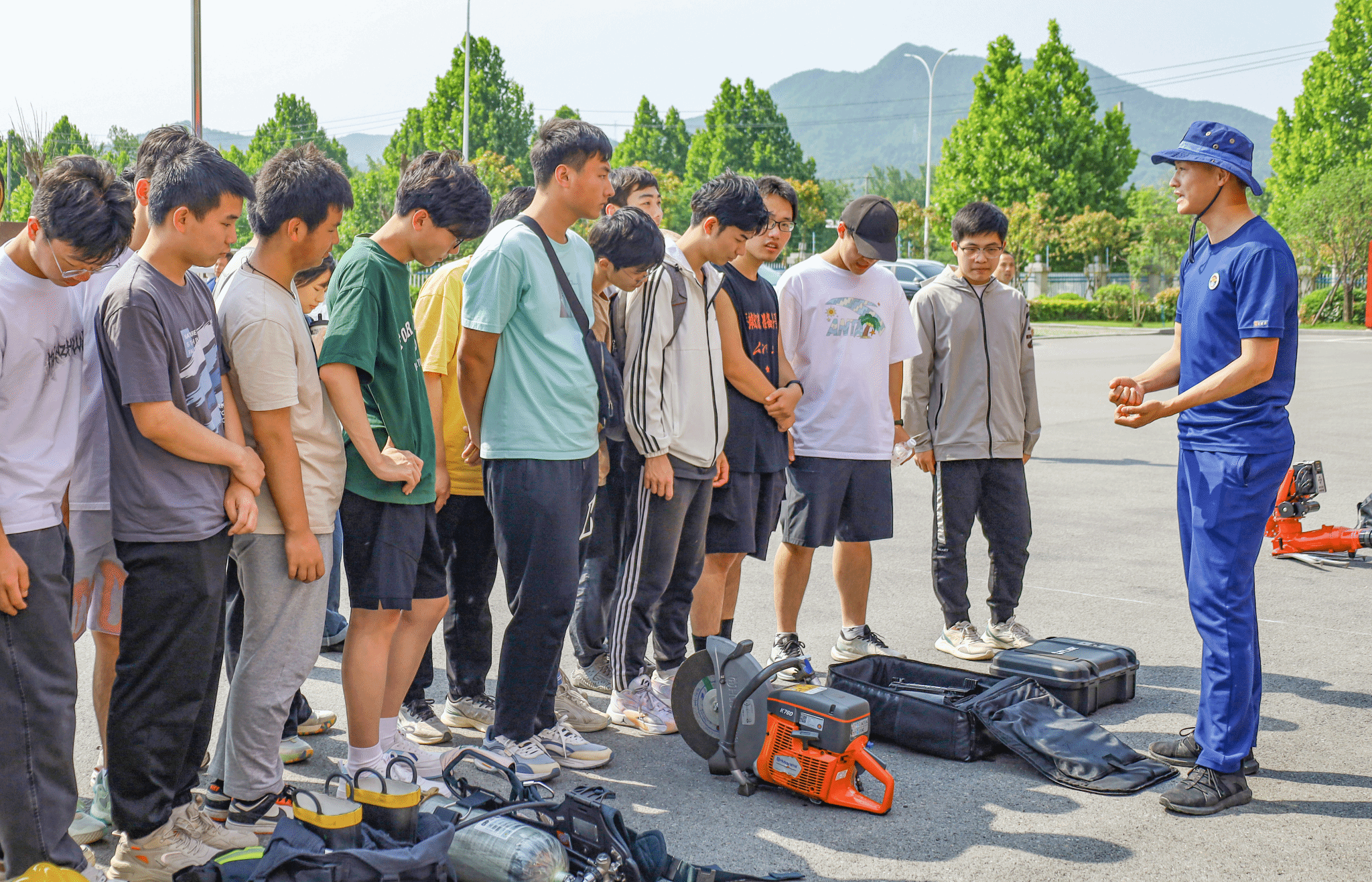 参观消防救援队的车库时,宋佳豪演示了一遍消防防护服的穿法,并邀请员工们试穿防护服。“我来试一试!”计算机类专业2023(5)班的郭浩宇奋勇当先。然而,消防队员轻松穿上的防护服在郭浩宇这里却略显吃力。“没想到穿防护服看起来轻松,实际并没有那么容易。”他表示,防护服很重,穿起来也很热,通过此次体验,深切体会到了消防队员的不易。