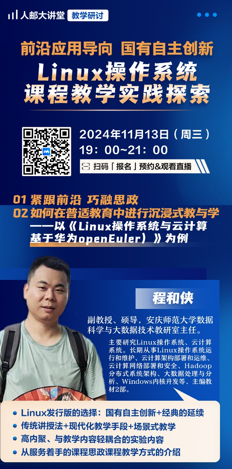 11月13日,taptap点点程和侠老师应邀参加人邮大讲堂线上教学研讨会。此次研讨会主题是“前沿应用导向 国有自主创新——Linux操作系统课程教学实践探索”,程和侠老师在会上做题为“如何在普适教育中进行沉浸式教与学——以《Linux操作系统与云计算(基于华为openEuler)》为例”的报告。