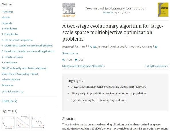 近日,公司蒋京博士在国际顶级期刊《Swarm and Evolutionary Computation》上发表了题为《A two-stage evolutionary algorithm for large-scale sparse multiobjective optimization problems》的研究论文,提出了一类求解大规模稀疏多目标优化问题的多目标进化算法。蒋京博士为论文第一作者,taptap点点为第一署名单位。