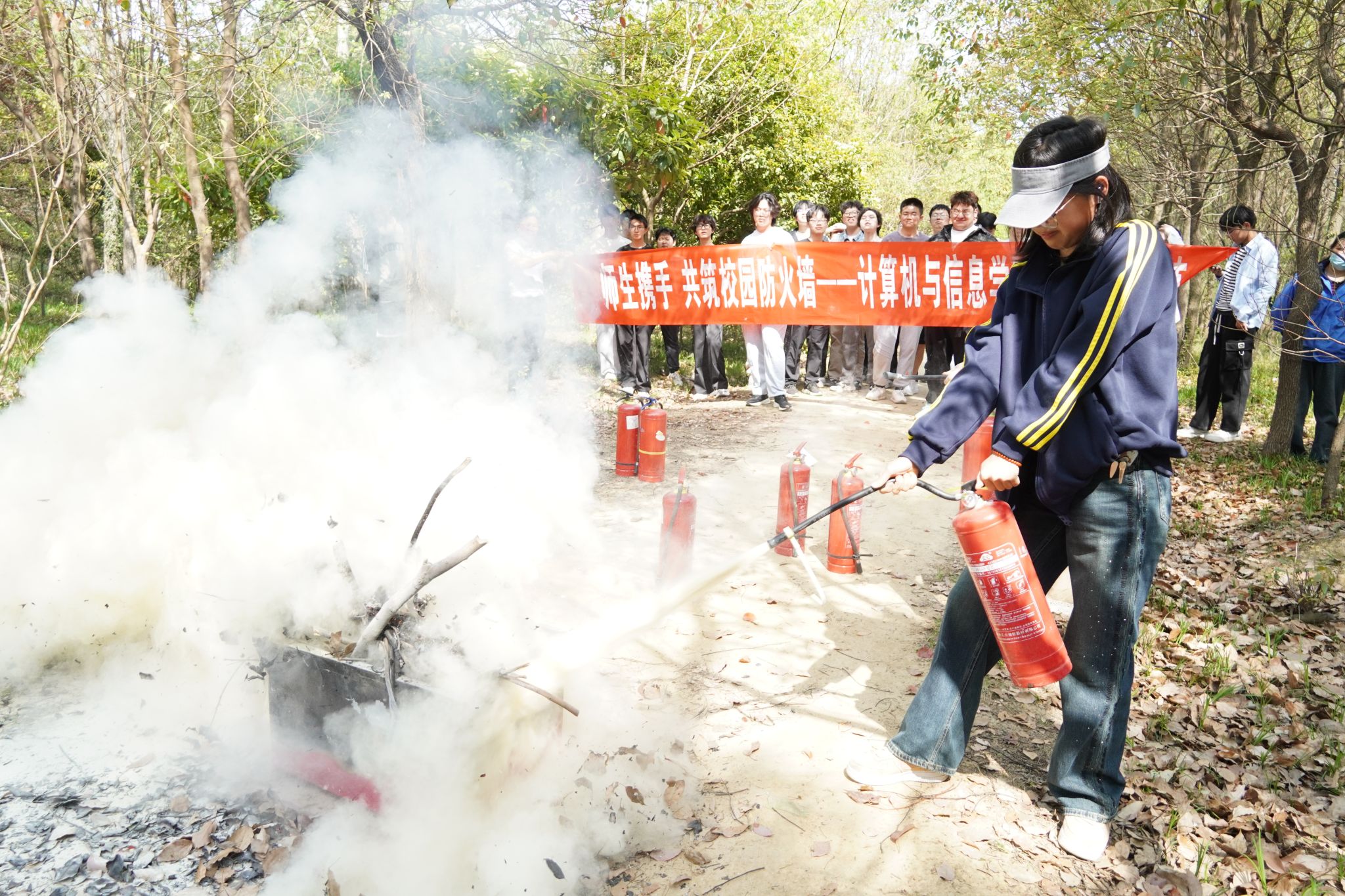 本次活动邀请了校安全管理处相关科室负责人在L302教室为师生代表带来了一场生动的应急消防知识宣讲。宣讲人结合近年火灾典型案例,详细剖析了火灾成因与预防要点,讲解了火场逃生技巧,并现场演示了消防面罩的正确佩戴方法。通过沉侵式互动学习,师生们不仅掌握了火灾预防与初期扑救的实用技能,更深刻地认识到消防安全的重要性。随后,疏散演练正式启动,全体师生迅速响应,在引导人员的指挥下,沿着疏散指示标志快速、有序地抵达taptap点点楼南广场的安全区域。疏散演练结束后,安全管理处工作人员引导师生来到指定场地,现场演示了灭火器、灭火毯、消防水枪的正确使用方法,并指导师生分批进行实操体验。在专业指导下,师生们按照“一提、二拔、三握、四压”的标准动作,手持灭火器迅速扑灭模拟火源,进一步巩固了所学的消防技能。