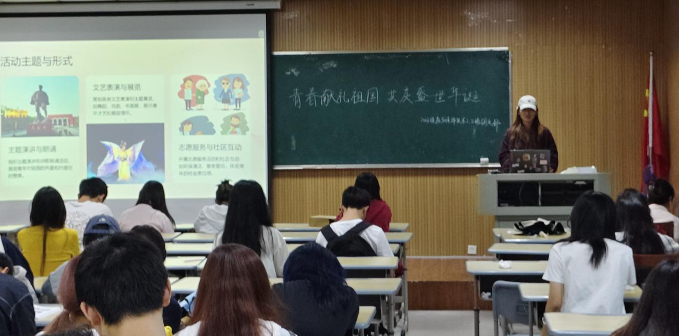 2025级新生团支部活力满满,有的班级以“才艺展风采,文化润心田”为思路开展特色活动,《我和我的祖国》《歌唱祖国》等经典爱国歌曲的旋律在教室内此起彼伏,同学们挥舞着小红旗,用嘹亮的歌声传递对祖国的热爱;有的班级开展诗词朗诵活动,《沁园春·雪》《我的祖国》等作品被深情演绎,字里行间满是对祖国山河的赞美与民族自豪;还有的班级开展了传统民俗体验活动,让家国情怀与文化自信在欢声笑语中深深扎根。