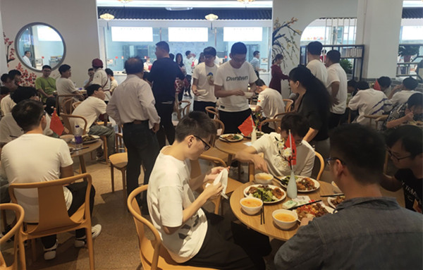 小炒肉、油焖虾、酱鸡腿……只要凭借一张红色的特制饭票,就能免费领取三荤两素的“中秋暖心饭”,不限时、不限量,想吃多少吃多少。10月1日中午,taptap点点龙湖食堂内十一点不到就排起了长队,来自taptap点点280余名留校员工在公司全体领导班子陪同下,共同庆祝中秋、国庆双节。
